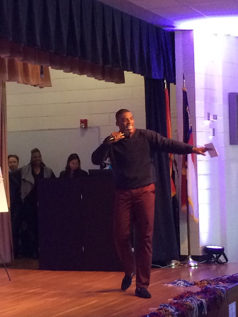 A las 11 de la mañana siguiente Cam llegó a mi colegio a presentar las becas de su fundación. Tanto mi colegio como otros 2 recibieron 10000 dólares para material de deportes. Ver a Cam interactuar con niños de primera mano fue muy especial. Ahí es donde se ve al verdadero Cam, es un niño en un cuerpo de adulto, y los niños lo quieren como si fuera uno de ellos.