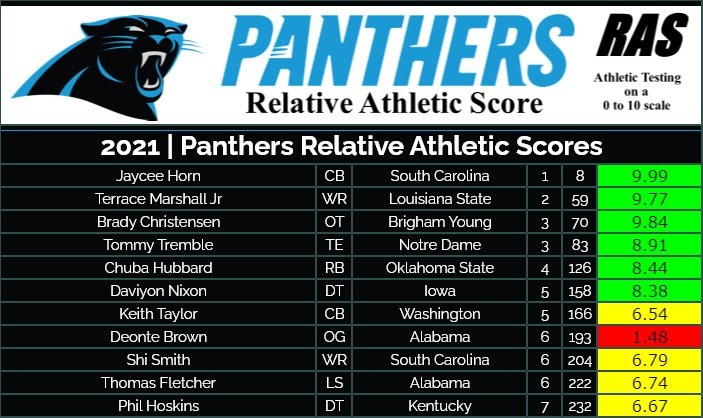 El equipo logró, usando varios traspasos, poder elegir a 11 jugadores, 7 de ellos en las primeras 5 rondas. Además, consiguieron una cuarta ronda de 2022 en un traspaso con Houston. Han llegado varios jugadores que cayeron en los boards por problemas físicos o extradeportivos, como puedan ser Terrace Marhall, Daviyon Nixon o Shi Smith. Las elecciones de los Panthers tienen algo en común, un perfil físico superior, como podéis ver en la siguiente imagen de la cuenta @mathbomb de twitter