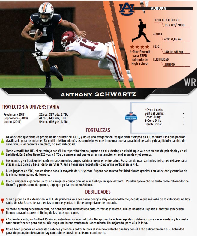 Con el pick 91 de tercera ronda Cleveland satisfacía otra de sus necesidades, un WR profundo, rápido y capaz de abrir el campo. Anthony Schwartz, WR, Auburn. Su tiempo en las 40 yardas así lo demuestra 4.26