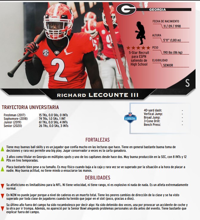De ellos llama la atención LeCounte, pese a ser un recluta 5 estrellas, y estando a esas alturas disponible Talanoa Ufanga o Hamsah Nasirildeen, entre otros Safeties. Un pick que, de momento no se acaba de entender excesivamente.