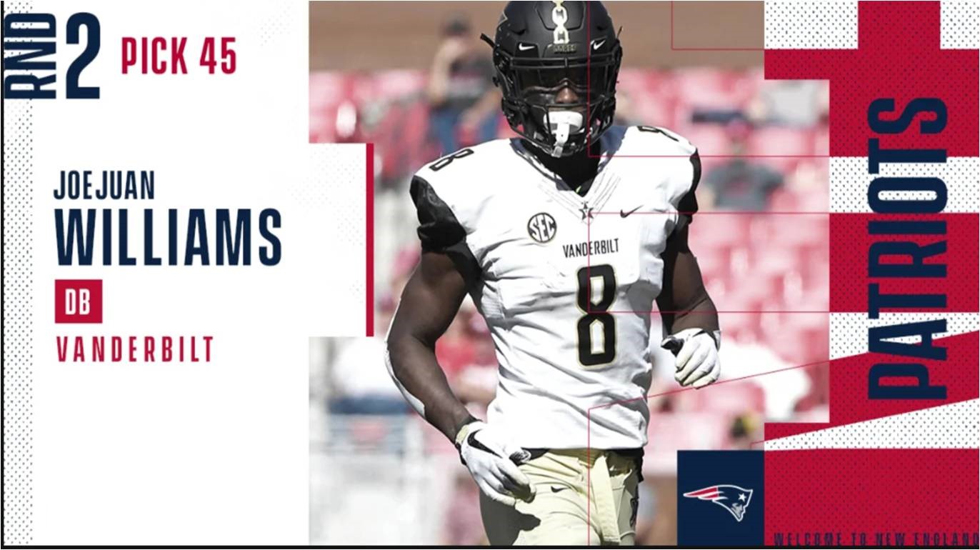El segundo día debía darnos opciones en las trincheras, líneas a ambos lados del balón, pero sobre todo un tight end. Sin embargo Bill Belichick realizó un movimiento que no suele hacer. Subir desde el #56 hasta el #45 y para elegir a un cornerback. Joejuan Williams, CB de Vanderbilt. Con este movimiento perdimos una de las elecciones de tercera ronda. La decisión de subir es probable que se tomara tras ver como salían 3 cornerbacks en los 8 primeros picks. JoeJuan debió llamar la atención del equipo de New England viendo los vídeos de sus enfrentamientos con los receptores de Georgia u Ole Miss. Lo que sí parece estar claro es que han seleccionado a este chico por lo que puede aportar de físico y tamaño. Puede cubrir a gente muy grande. En la memoria la final de la AFC y los problemas con Travis Kelce hasta que usamos a JC Jackson. Puede que pelee por ser titular, pero se ha seleccionado para tener una opción de cornerback para los receptores, o tight ends, grandes y físicos que están apareciendo cada vez en mayor medida.