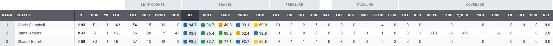 Que un DT consiga un total de 10 presiones al QB, 3 de ellas sacks en 54 snaps ya es importante, pero también fue decisivo parando la carrera y 3 de sus placajes fueron para pérdida de yardas. Puntos de Fantasy: 26