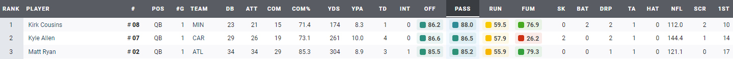 En esta sección veremos el Top 3 de cada posición relevante. Aquellos que pasan, los que reciben, los llamados a correr, los que ayudan, los que defienden para que todo esto no ocurra… En definitiva, el Top 3 de los Grades de PFF. Así mismo, Haremos una proyección a sus puntos conseguidos en la Fantasy (Standard no PPR – Fleaflicker). Venga, vamos ello, que va a ser divertido. Podéis pinchar en las imágenes para hacerlas más grandes y visibles.