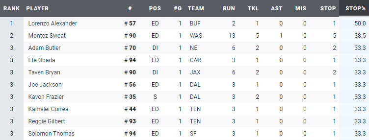 El porcentaje de PFF en lo que llama «Run Stop Percentage» se centra sólo y exclusivamente en las jugadas de carrera y los stops. El impacto de los jugadores defensivos en el juego de carrera a veces se confunde con hacer muchos tackles, y no es así. Es más importante un stop, hacer que el ataque no avance, que pierda yardas. Aquí se contabilizarán el porcentaje de stops realizadas por snaps, únicamente en las jugadas de carrera.