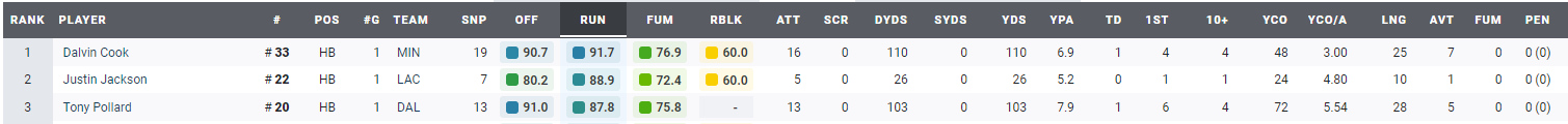 La línea ofensiva de Cowboys es tan buena que hace que su segundo RB también consiga impresionantes estadísticas. Tanto Elliott como Pollard superaron las 100 yardas de carrera pero este realizó un partido más impresionante con 72 yardas después del contacto (5.54 por carrera), consiguió 6 primeros downs e hizo fallar 5 placajes. Puntos de Fantasy: 21,8
