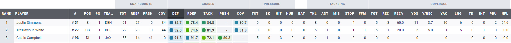 El porcentaje de PFF en lo que llama «Run Stop Percentage» se centra sólo y exclusivamente en las jugadas de carrera y los stops. El impacto de los jugadores defensivos en el juego de carrera a veces se confunde con hacer muchos tackles, y no es así. Es más importante un stop, hacer que el ataque no avance, que pierda yardas. Aquí se contabilizarán el porcentaje de stops realizadas por snaps, únicamente en las jugadas de carrera.