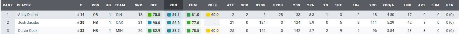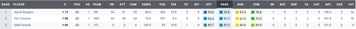 En esta sección veremos el Top 3 de cada posición relevante. Aquellos que pasan, los que reciben, los llamados a correr, los que ayudan, los que defienden para que todo esto no ocurra… En definitiva, el Top 3 de los Grades de PFF. Así mismo, Haremos una proyección a sus puntos conseguidos en la Fantasy (Standard no PPR – Fleaflicker). Venga, vamos ello, que va a ser divertido. Podéis pinchar en las imágenes para hacerlas más grandes y visibles.