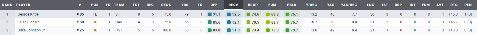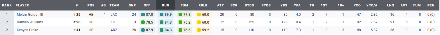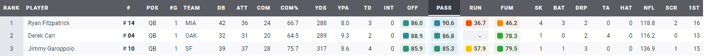 En esta sección veremos el Top 3 de cada posición relevante. Aquellos que pasan, los que reciben, los llamados a correr, los que ayudan, los que defienden para que todo esto no ocurra… En definitiva, el Top 3 de los Grades de PFF. Así mismo, Haremos una proyección a sus puntos conseguidos en la Fantasy (Standard no PPR – Fleaflicker). Venga, vamos ello, que va a ser divertido. Podéis pinchar en las imágenes para hacerlas más grandes y visibles.