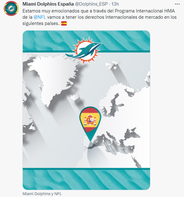 8.- Sí, nosotros somos activos en Twitter, y hemos visto que los Dolphins ya han creado una cuenta de Twitter de Dolphins España, oficial. Y España está muy emocionada por haber sido elegida por dos franquicias, muestra el crecimiento que ha tenido el deporte en España, que es exponencial.