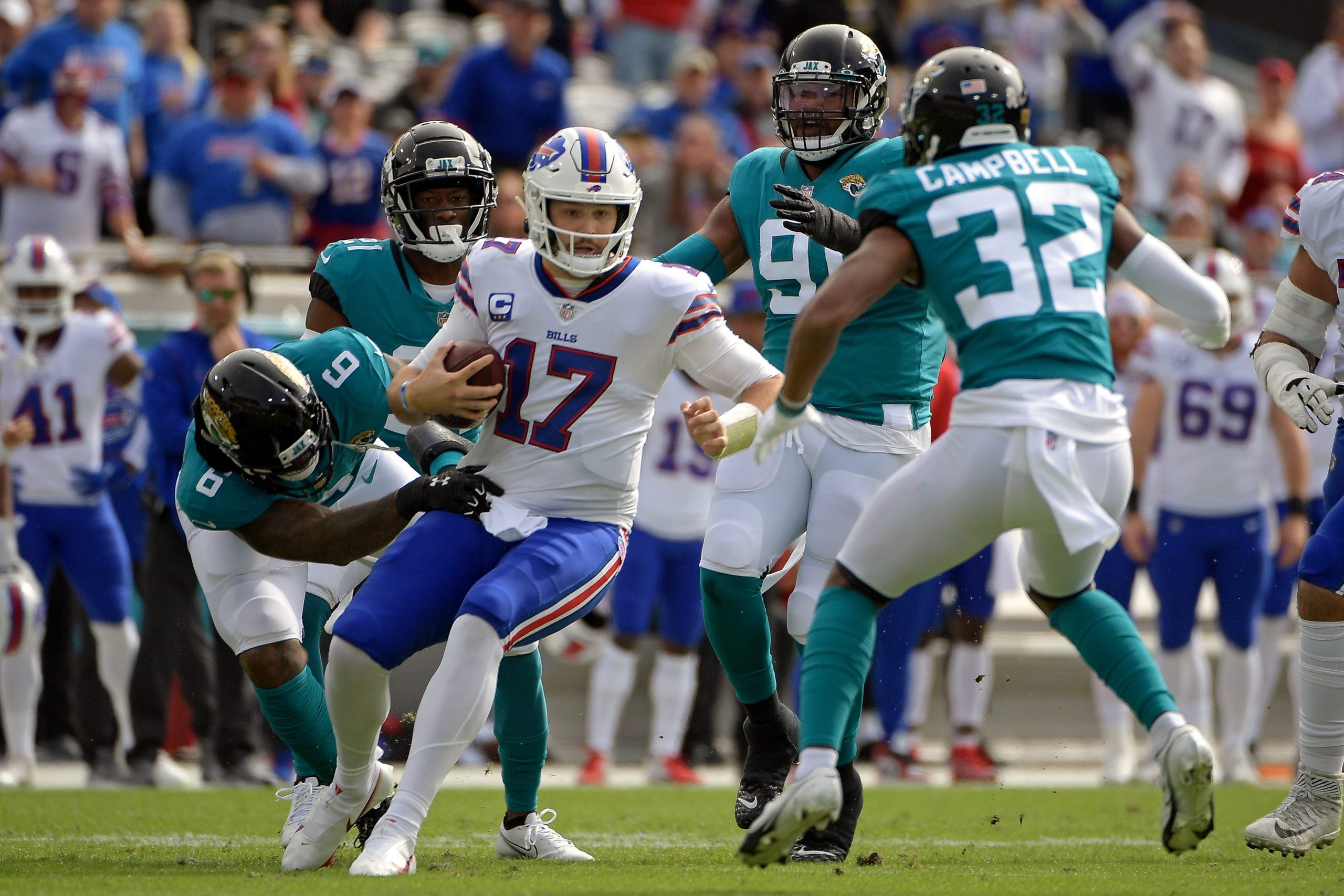 Unos Buffalo Bills que también llegaban con lesiones importantes en la línea sufrieron ante la presión de Jacksonville y comenzó el curioso duelo entre Josh Allen (QB de los Bills) frente a Josh Allen (DE de los Jaguars). La situación de que un quarterback reciba un sack por parte de un jugador con su mismo nombre, que es la primera vez que tiene lugar en la liga desde que se tienen registros.
