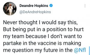 Sin ir más lejos, ayer DeAndre Hopkins, WR estrella de los Arizona Cardinals, tuiteó (y luego borró) que no estaba de acuerdo con que les “obliguen” a vacunarse y que se planteaba su futuro en la NFL